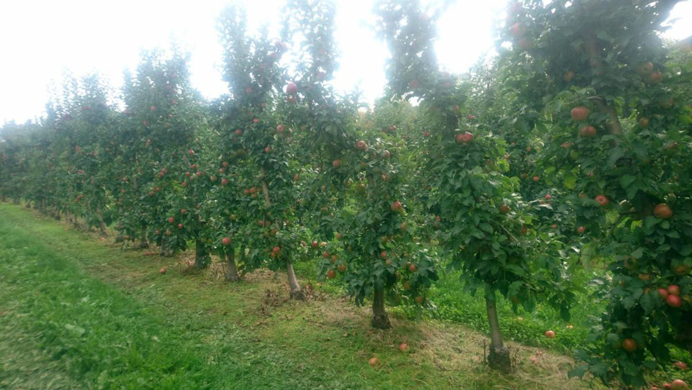 duże pełno owocujące drzewa wykopywane z bryłą korzeniową, zabezpieczona jutą i siatką metalową biodegradacyjną [ z którą się sadzi jabłonie]